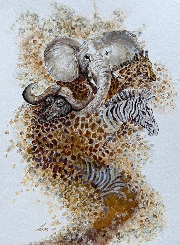 Diese Werkserie widmet sich der fragilen Grenze zwischen Präsenz und Auflösung im afrikanischen Lebensraum. Die dargestellten Tiere erscheinen nicht als feste Körper, sondern als Übergänge — sie zerfallen in Staub, Erde, Luft und Erinnerung. Ihre Formen lösen sich auf, als wären sie bereits Teil der Landschaft geworden, die sie einst bewohnten.
