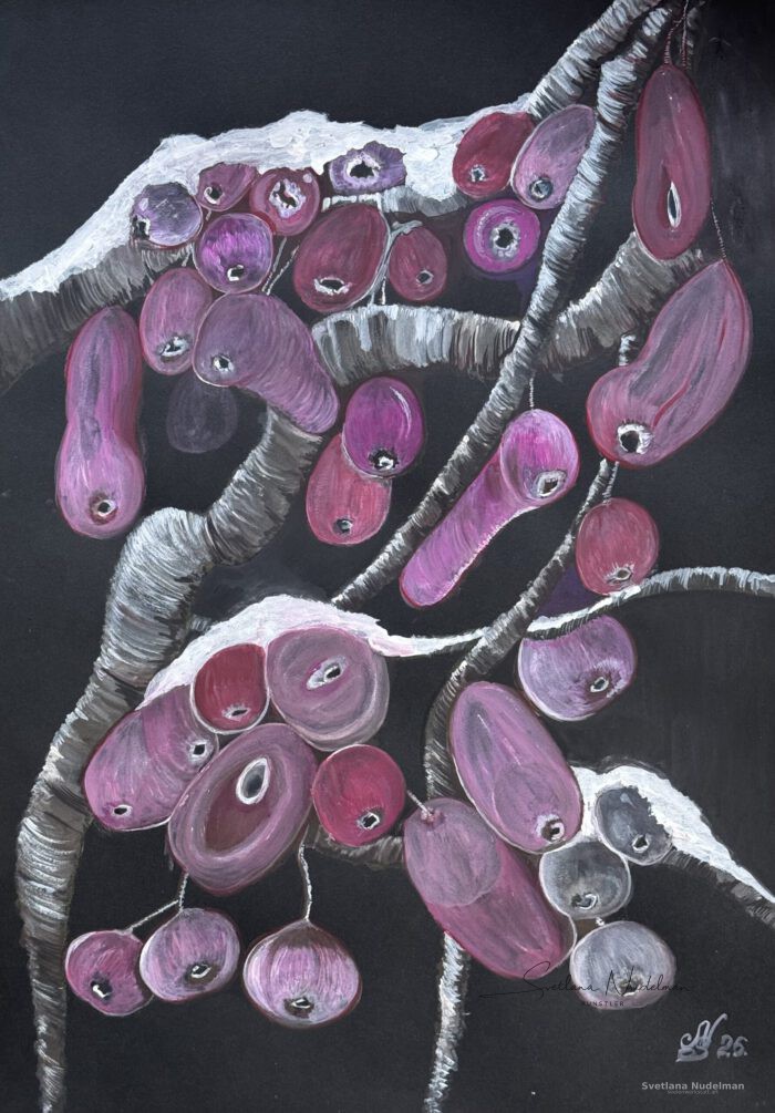 Äpfel im Garten. Der Januar-Schnee bedeckte die Äpfel wie ein sanfter Schleier. Für einen Kölner Winter war viel Schnee gefallen. Und durch die Scheibe des Wohnzimmers fielen die Äpfel in einem anderen Licht auf. Sie veränderten ihre Form und Farbe und flossen zusammen mit dem schmelzenden Schnee nach unten.